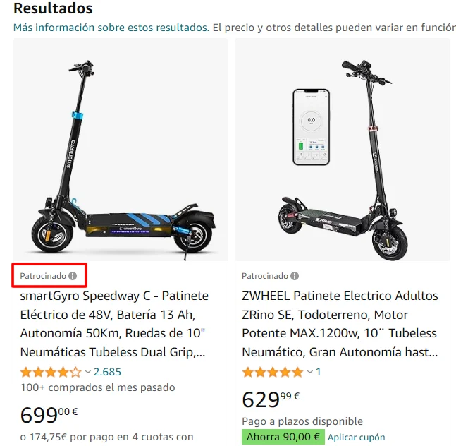 Al realizar una simple búsqueda «patinete eléctrico», nos encontramos los productos patrocinados, estos se llevarán más del 30% de todas las ventas de la categoría solo por salir en las primeras 3 filas de la página 1 resultados.